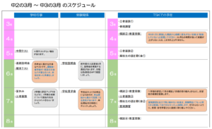 下の画像は、中学2年から受験までのスケジュールを簡単にまとめたものです。画像を拡大すれば読めるようにはなっています。それでも画質が荒く読みづらい箇所がありますので、中1生・中2生の保護者の方には、次回の面談時に紙面資料をお渡しします。