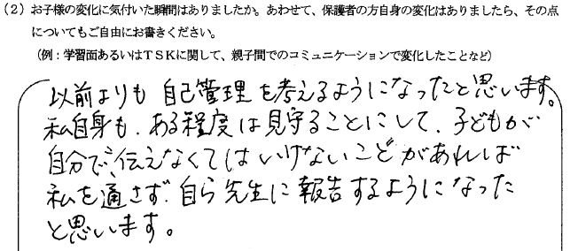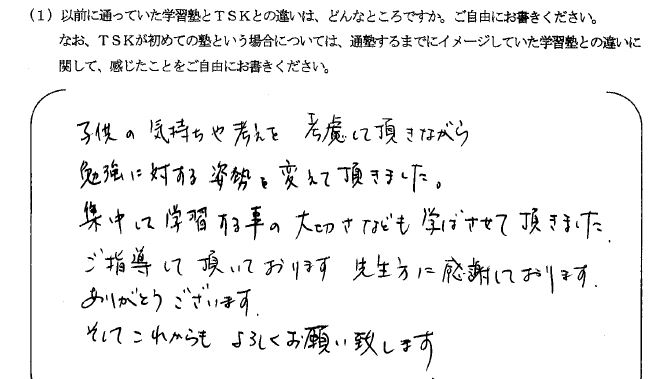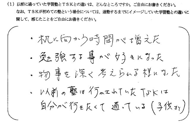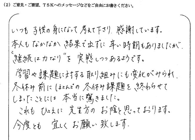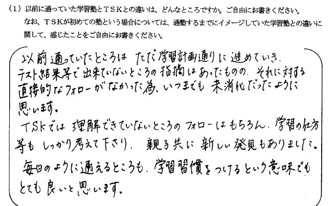 ただ単に塾に通うだけでは、なんとなく塾に行っている親の安心感だけで成績が伸びないと思っていました。しかしTSKでは、学校の進度に合わせて自分の分からないところを基礎から丁寧に教えていただけるので、教えてもらいたい問題を自分でピックアップしてから通塾できていると本人から聞いています。またTSKでの雰囲気が他のみんなもきちんと勉強しているそうで、勉強のスイッチがすぐに入り集中できるそうです。