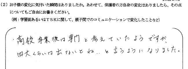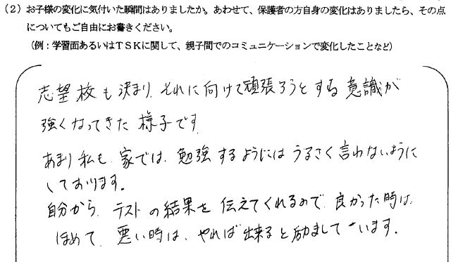 こまめに面談をしていただき、学習状況等が分かるので安心できました。また、本人の杉山先生への受け答えの様子からも、課題や変化が感じられました。面談の時はもちろんですが、塾から帰ってきた時に、先生からこう言われた、こんな話があった等、報告する様子からも、先生方を信頼していることが伝わりました。性格的なことも含めて理解していただいているんだな、と感じることが多かったです。本人が私立ではなく、都立を第一志望にしたのも、高校に進学しても塾の時間を継続したいと考えたことも理由の一つのようです。塾に対してアレルギーのある息子にとって、TSKの雰囲気は一人一人がそれぞれの目標に向かって集中できるようなところで、とても居心地がいいようでした。面談以外でも、ブログで先生方の考えや子供たちの実態を知ることができ、楽しみにしております。