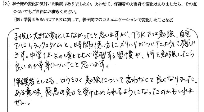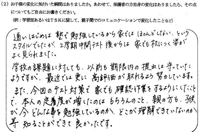 半年前の入塾した頃は、新しい環境に慣れるのに、必死な様子でした。今は良い意味で、穏やかに塾に通っています。それは勉強方法も分かってきたからなのかな?と思ってます。塾に行っていなかった中1の頃、教科書だけでなく参考書も使い、ひたすら勉強している様子でした。現在は苦手なところを理解して今やるべき勉強内容を日々書き出し、目の付くところに貼り出している様子から、時間の使い方が上手になったと思います。そしてTSKに通ってから、小テストに向け自発的に努力している姿を見て、頼もしくなっているように感じます。努力の達成感もあり、心も豊かになり、少しずつ自信がついて性格も明るくなってきた感じがします。