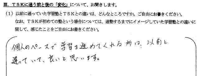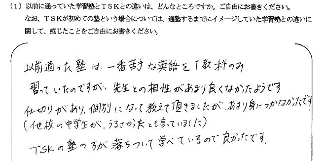 「以前に通っていた学習塾とTSKとの違いを教えてください。なお、TSKが初めての塾の場合は、イメージしていた学習塾との違いについて教えてください。」