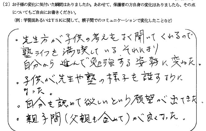 塾はただ勉強を教えてもらったり宿題を多く課せられるイメージだったが、TSKでは勉強の方法だけでなく、勉強をすることの意味や勉強に対する向き合い方について、子ども自身に考えさせて、行動変容が起こるように指導していただけています。また、子どもの性格をとらえて、指導方法や課題を考えていただけています。